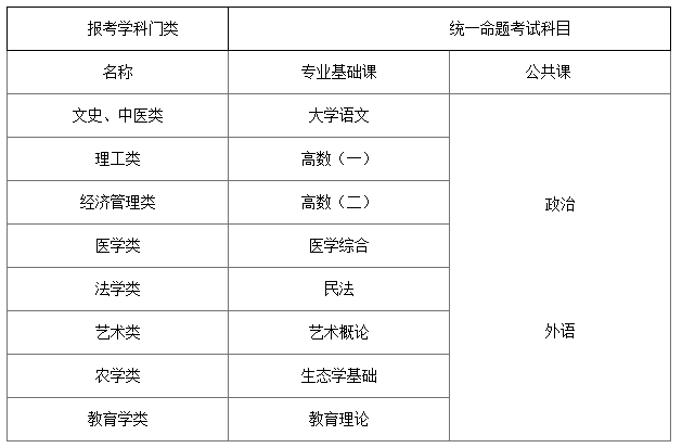 專科起點升本科各學科門類與統一命題考試科目一覽表