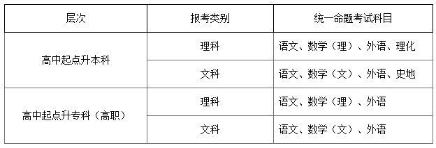 高中起點升本、專科(高職)統一命題考試科目一覽表